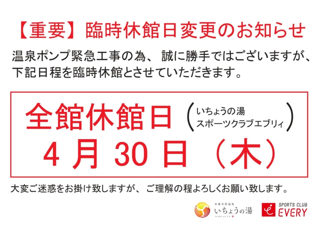 4月30日(木)温泉ポンプ緊急工事の為、誠に勝手ではございますが水巻天然温泉いちょうの湯・スポーツクラブEVERY全館臨時休館とさせていただきます。