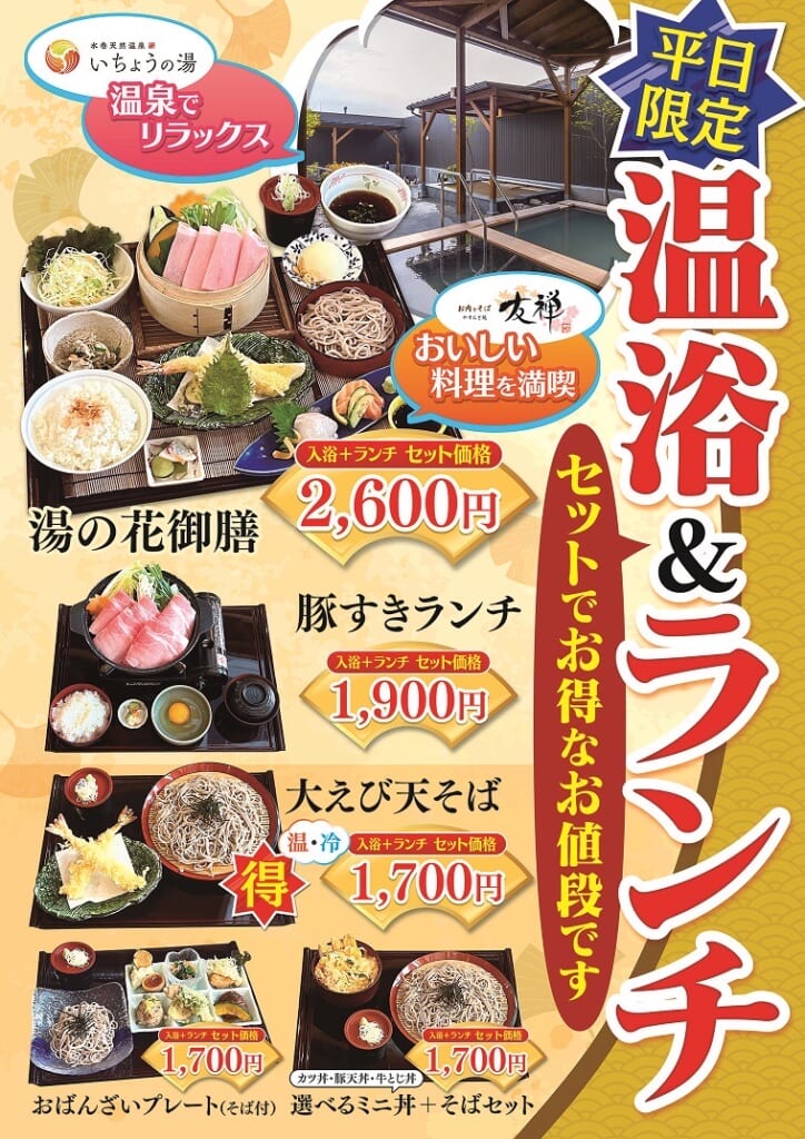 いちょうの湯お食事処『お肉とそば やすらぎ処 友禅』より”平日限定”のお得な【温泉入浴券付きランチメニュー』が4月20日(月)より登場いたします!